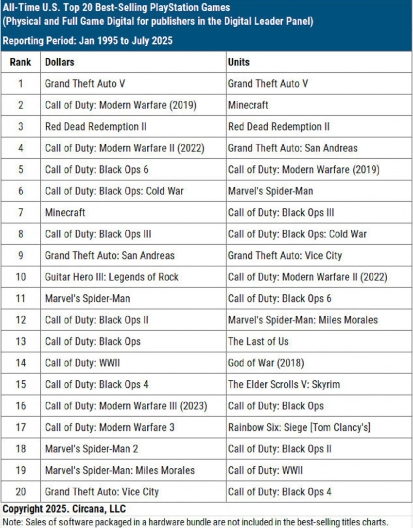 Ещё одним мастодонтом в чарте стала Call of Duty. Шутер Call of Duty: Modern Warfare (2019) идёт сразу после GTA 5 с точки зрения долларовой прибыли, но находится на пятой строчке по числу продаж. Зато второе место с точки зрения тиража отведено песочнице Minecraft. Разные части COD разбросаны по чарту: более десяти разных игр, включая последнюю на данный момент Call of Duty: Black Ops 6.