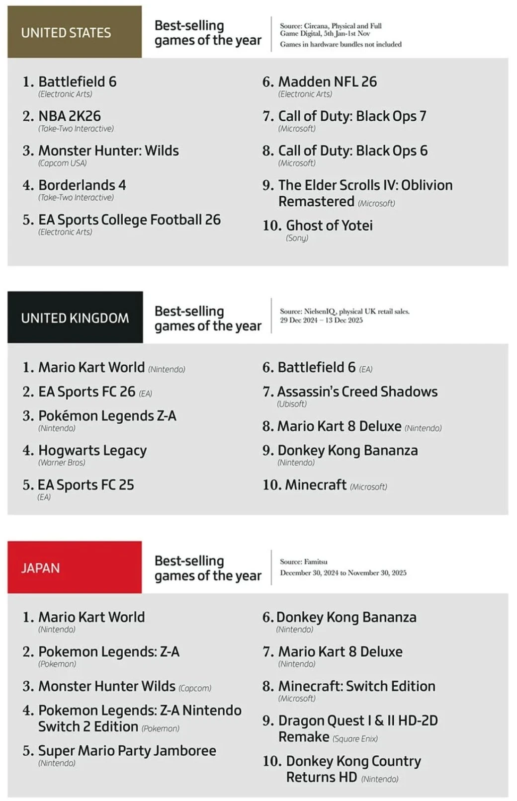 А что насчёт самых продаваемых игр в разных странах? Посмотрим на примере США, Японии и Соединённом королевстве.