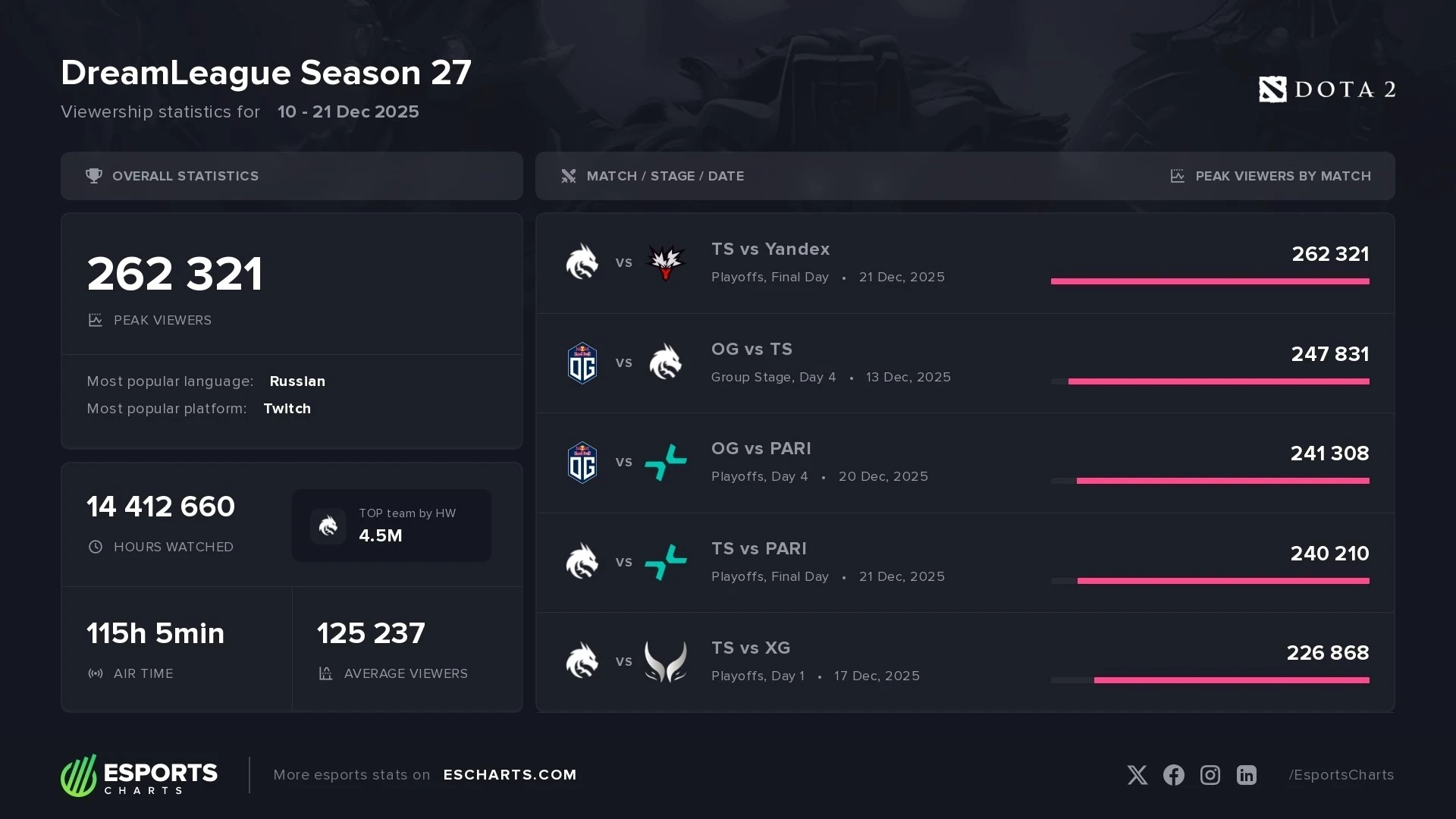 • Популярные команды: В топ-5 по просмотрам, помимо финалистов, вошли матчи с участием OG, PARIVISION и Xtreme Gaming.