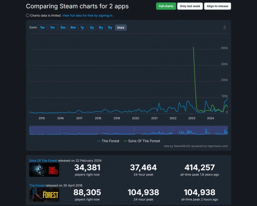 Как можно заметить, выживалка семилетней давности благодаря скидкам обошла в популярности Sons of the Forest, новую игру Endnight Games. После стартового пика интереса она постепенно начала терять игроков, и сейчас её максимальный суточный онлайн в Steam составляет 37 тысяч человек.