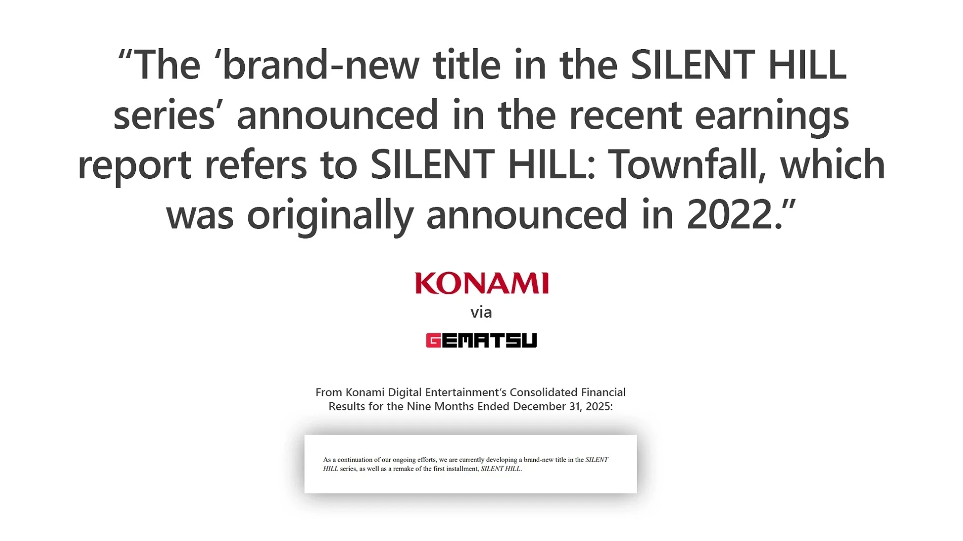 Таким образом, официально в рамках серии разрабатываются Silent Hill: Townfall и ремейк первой Silent Hill, над которой трудятся авторы ремейка SH2.