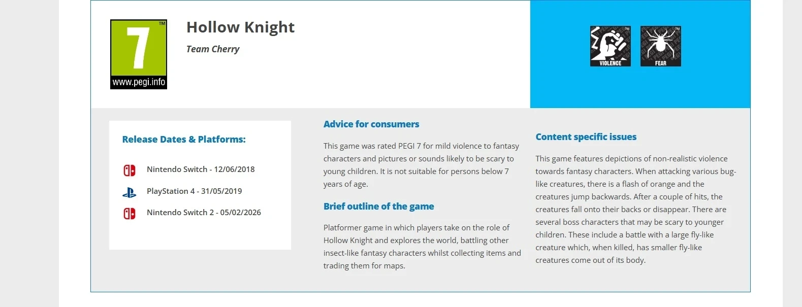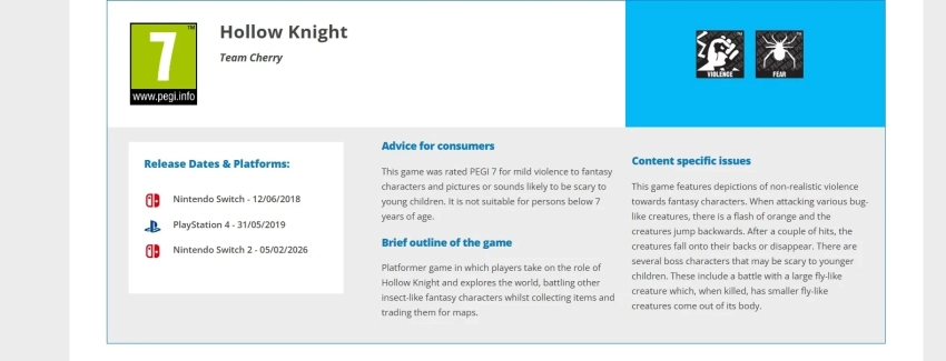 Обложка: скриншот игры Hollow KnightTeam Cherry анонсировала версию Hollow Knight для Nintendo Switch 2 ещё в декабре, но без даты релиза. А сегодня на сайте PEGI заметили упоминание соответствующего возрастного рейтинга игры.