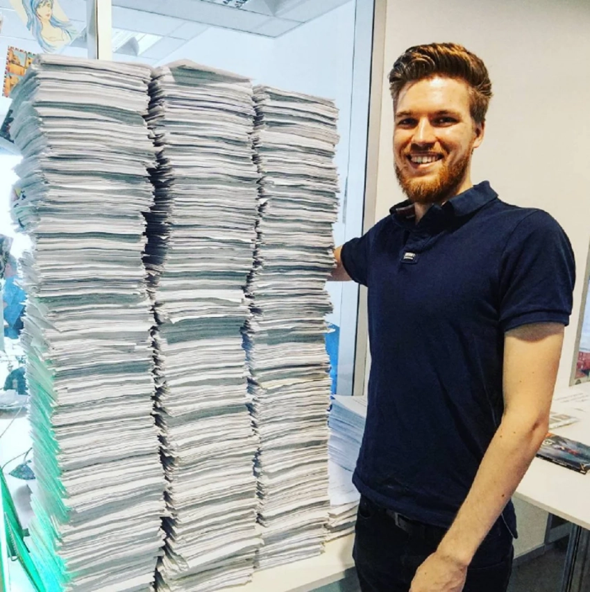 Это я рядом со сценарием Kingdom Come Deliverance, напечатанным на обеих сторонах, по 2 страницы с каждой стороны.
