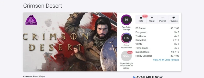 На популярных агрегаторах Crimson Desert получила 78-80 баллов. Это хороший результат, но, судя по падению стоимости акций, рыночные ожидания он не оправдал.