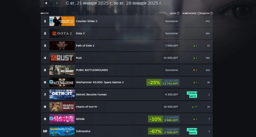 Чарт продаж Steam в период с 21 по 28 января 2025 года