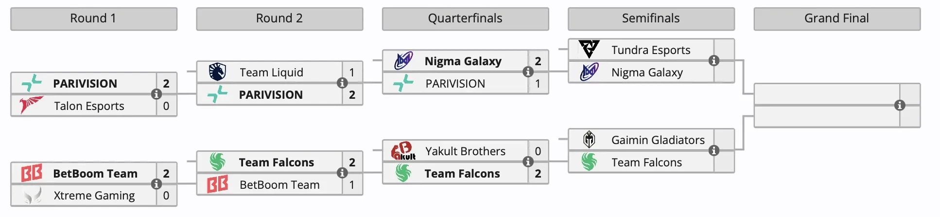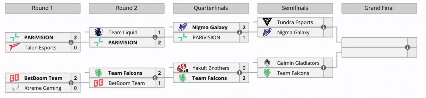 Самое интересное о кино на YouTube канале Игромании!Обложка: Nigma GalaxyЗавершились четвертьфинальные поединки плей-офф турнира BLAST Slam II по Dota 2. Команда Nigma Galaxy выбила из турнира PARIVISION со счетом 2:1, а Yakult Brothers уступила Team Falcons со счетом 0:2.