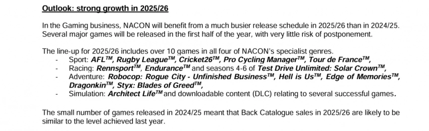 В следующем финансовом году Nacon планирует выпустить более десятка игр во всех жанрах, на которых специализируется компания. В приведенном списке указаны спортивные проекты, гоночные игры, приключения и симуляторы. В отчёте также отмечают, что компания ожидает роста продаж благодаря выходу консоли Nintendo Switch 2.