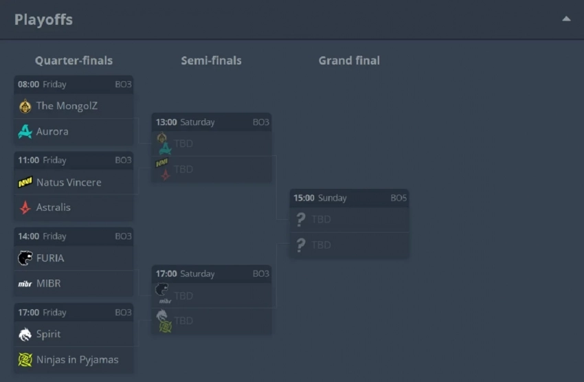 Ninjas in Pyjamas и Spirit сразятся в четвертьфинале завтра вечером — 16 мая в 17:00 по МСК. Бой будет проходить в формате BO3. На тот же день намечены ещё три сражения:
