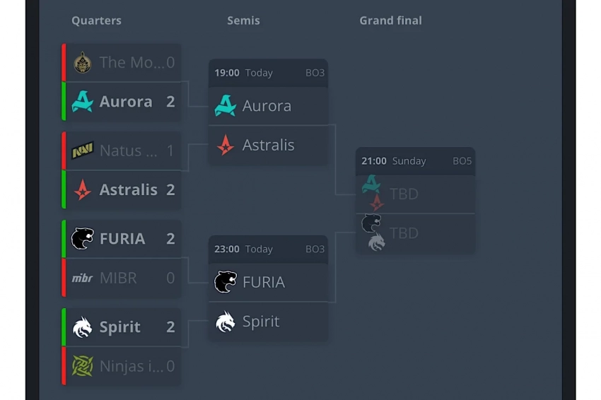 Теперь Spirit 17 мая в 17:00 (мск) сыграет в полуфинале с FURIA Esports. Также в полуфинал попали Aurora и Astralis. Их противостояние намечено на 13:00 (мск).