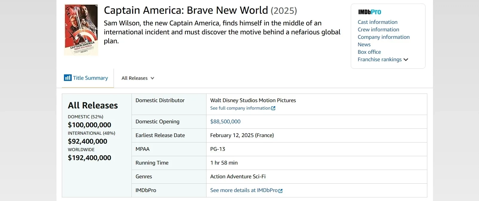 «Капитан Америка: Новый мир» собрал в мировом прокате почти 200 млн долларов