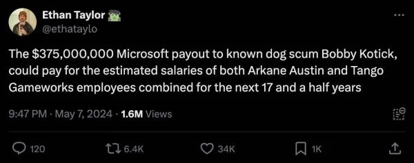 Итан Тейлор, редактор кинематики Stray Gods, резко раскритиковал Microsoft и Бобби Котика в своем личном аккаунте Twitter/X. Он напомнил, что выплата Microsoft в размере 375 миллионов долларов одному Котику могла бы покрыть зарплаты всех сотрудников Arkane Austin и Tango Gameworks на следующие 17 с половиной лет.