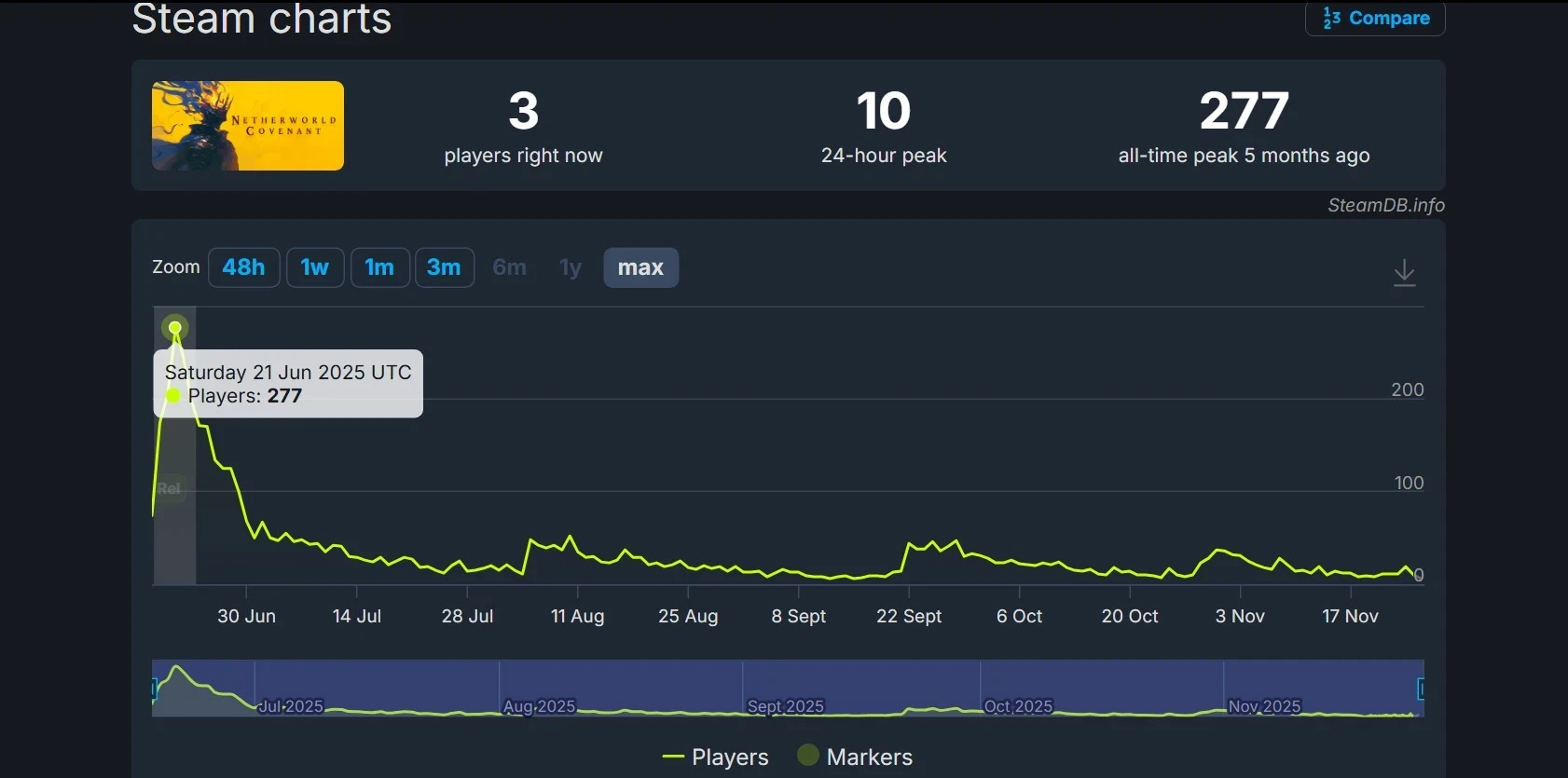 Пиковый онлайн Netherworld Covenant в Steam составил 277 человек в первые дни после выхода в раннем доступе. Однако в последние месяцы суточный пик с трудом достигает и десяти игроков. Возможно, с выходом версии 1.0 рогалик сможет привлечь больше внимания и фанатов.