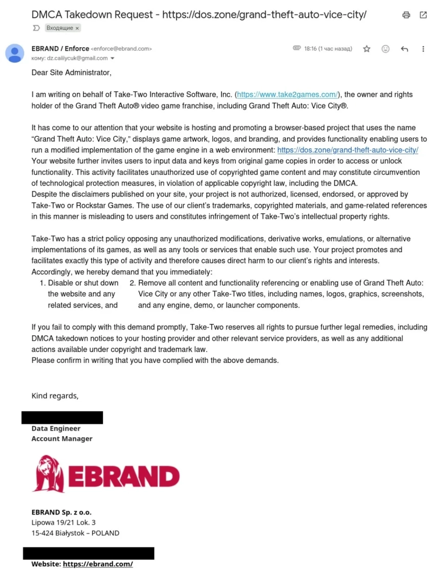 Обложка: скриншот игры Grand Theft Auto: Vice CityАвторам браузерной версии Grand Theft Auto: Vice City пришлось удалить игру из-за DMCA-страйка, предупреждения о нарушении авторских прав. Его направили Take-Two и Rockstar.