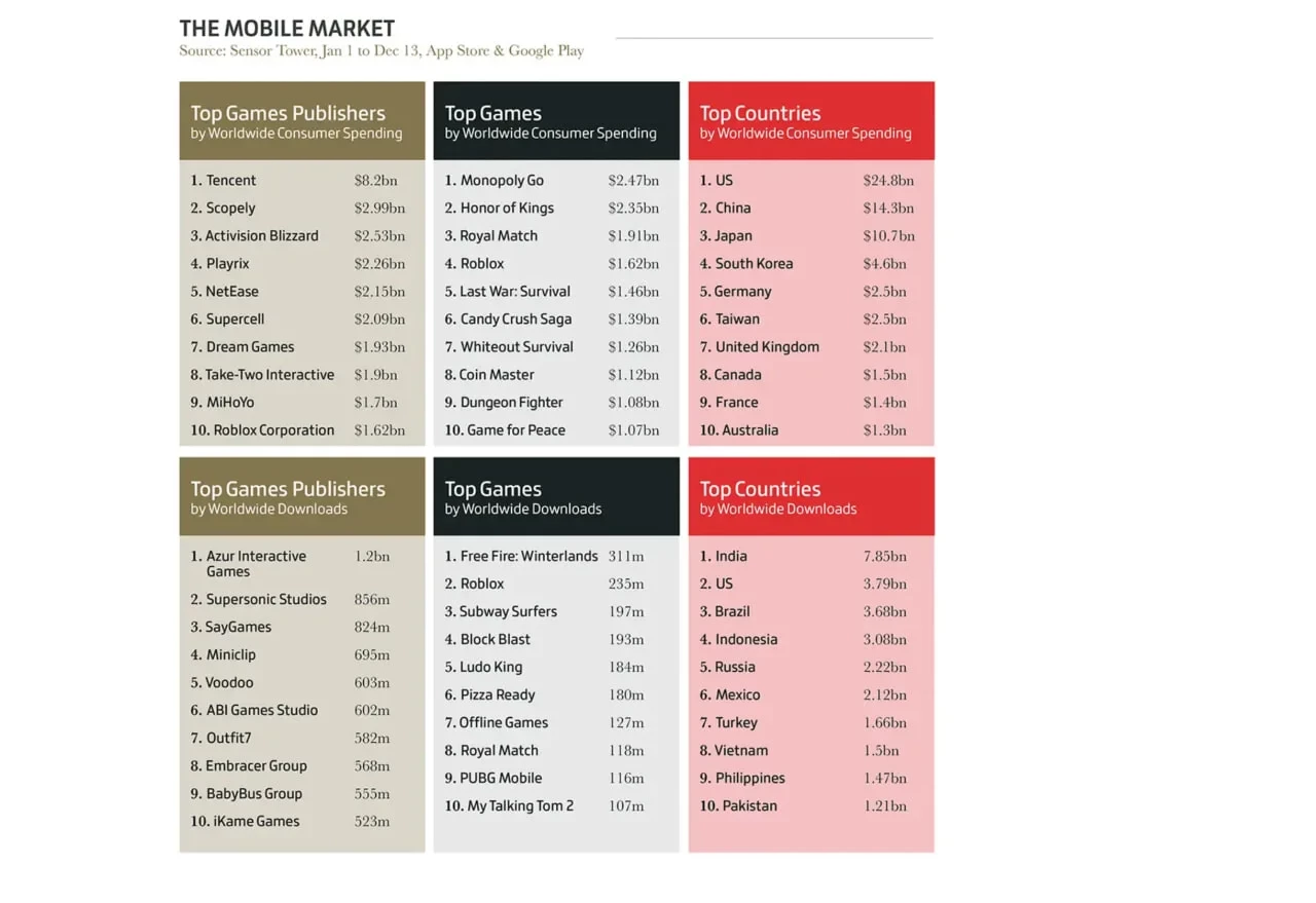 Лидером среди издателей на мобильном рынке (по тратам пользоватей) выступает Tencent, на втором и третьем месте — Scopely и Activision Blizzard.