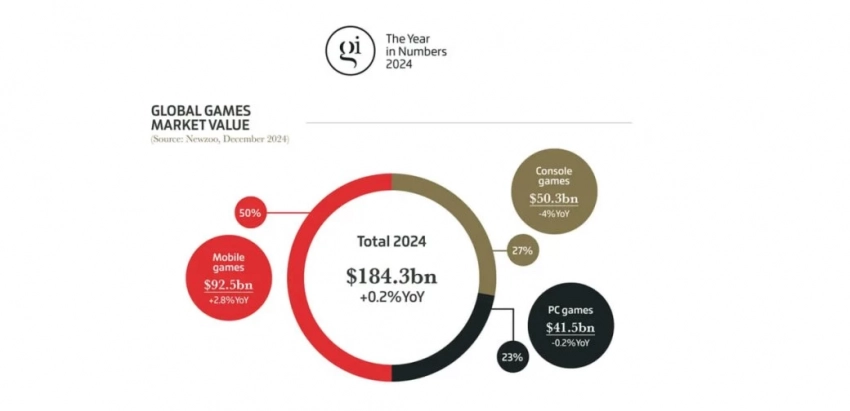 Объём игрового рынка за 2024 год составил 184,3 млрд долларов (рост в 0,2%), ровно 50% от суммы пришло с мобильного направления (92,5 млрд). На консоли пришлось 27%, на PC — 23%.