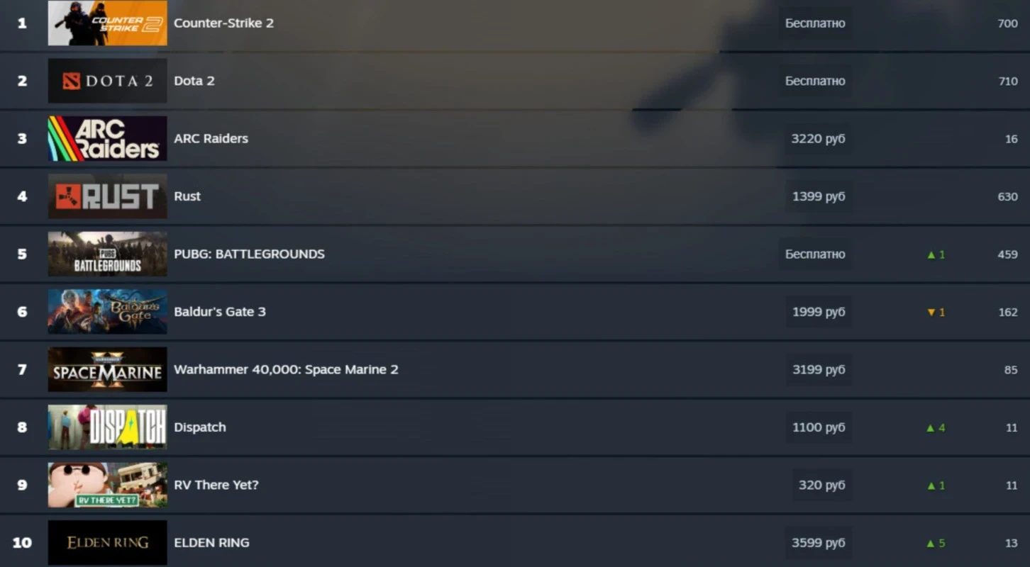 В российском чарте заметных изменений нет. В лидерах всё ещё Counter-Strike 2 и Dota 2, тройку лидеров замыкает Arc Raiders, а на 4 и 5 позициях находятся Rust и PUBG: Battlegrounds.