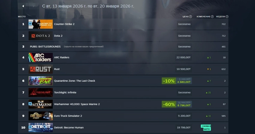 Обложка: скриншот Quarantine Zone: The Last CheckValve поделилась данными о самых прибыльных продуктах в Steam в период с 13 по 20 января. В сравнении с прошлой неделей лидер не изменился — Counter-Strike 2 продолжает занимать первое место. А вот на втором расположилась ARC Raiders, которая в этот раз смогла обогнать Steam Deck.