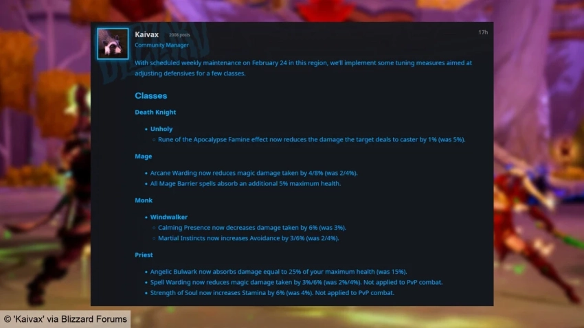 Маги, традиционно считающиеся «хрупким» классом, получили усиление: снижение магического урона от «Защиты от магии» увеличено с 2/4% до 4/8%, а все барьеры теперь дополнительно поглощают 5% от максимального запаса здоровья. Монахи-ветровики также стали устойчивее — «Успокаивающее присутствие» теперь снижает урон на 6% вместо 3%, а «Боевые инстинкты» повышают уклонение до 3/6% вместо прежних 2/4%.