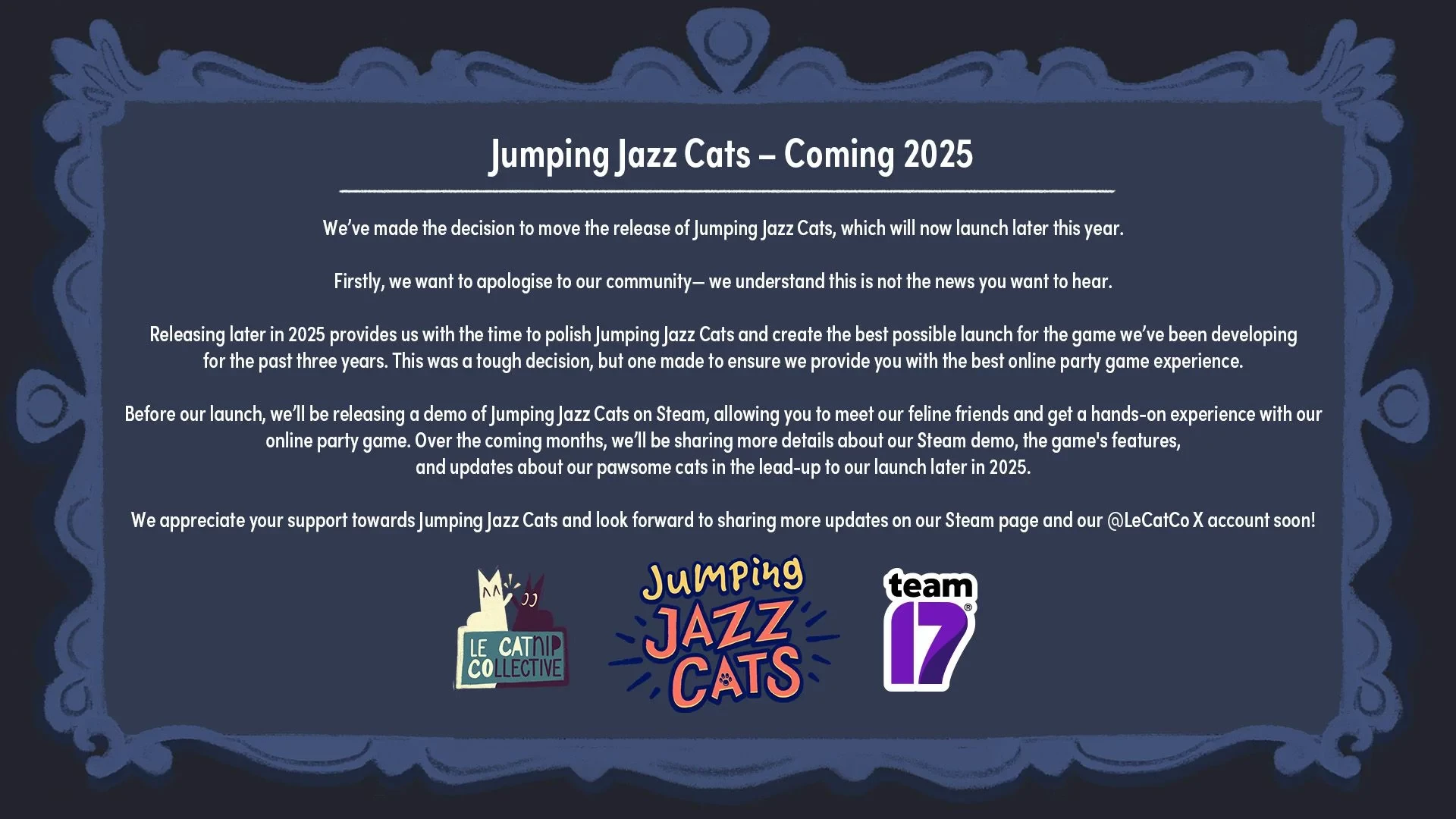 Создатели кошачьего кооператива приносят извинения тем, кто ждал обещанный релиз, и заверяют, что решение было непростым. Однако авторы Jumping Jazz Cats хотят сделать свою игру как можно более весёлой, и дополнительные месяцы пойдут этому на пользу.