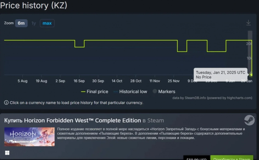Согласно базе данных Steam, в последний раз Horizon Forbidden West продавалась в Казахстане по цене в 23,5 тысячи тенге. Однако 21 января страница игры пропала из местного сегмента Steam.