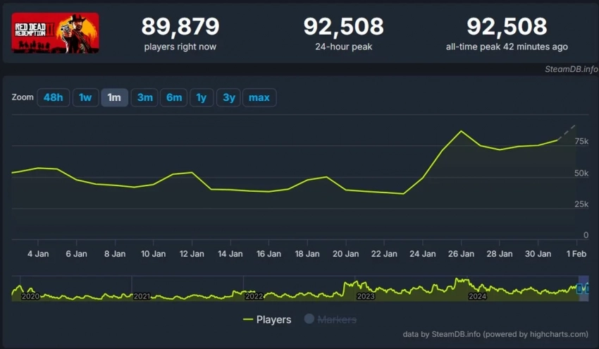 Напомним, что всего несколько дней назад пиковый онлайн игры достиг 86 717 человек. И вполне возможно, это не последнее достижение Red Dead Redemption 2: распродажа, в которой участвует игра, продлится до 6 февраля.