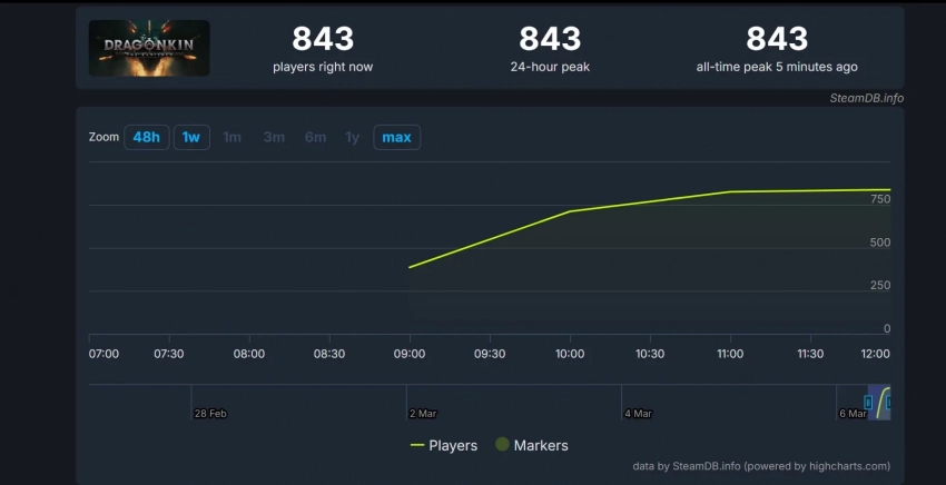 Что касается пикового онлайна, то пока он составил 843 человека. Вероятно, ближе к вечеру в Dragonkin: The Banished захочет поиграть больше геймеров, которые ожидали ролевой экшен с момента анонса.