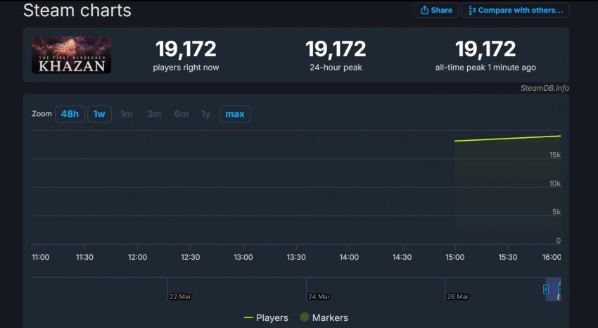 В момент написания новости пиковый онлайн The First Berserker: Khazan в Steam превысил 19 тысяч человек и продолжает расти. Возможно, разработчики смогут добиться гораздо более высокой отметки в пятницу вечером или на выходных.