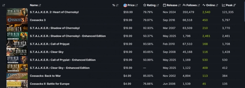 Что касается пикового онлайна, то в момент написания новости в S.T.A.L.K.E.R.: Shadow of Chornobyl - Enhanced Edition находится почти 2,5 тысячи человек. В Call of Pripyat пока собралось чуть более 500 человек, а в Clear Sky — 412 игроков. Вероятно, ближе к вечеру онлайн всей трилогии возрастёт.