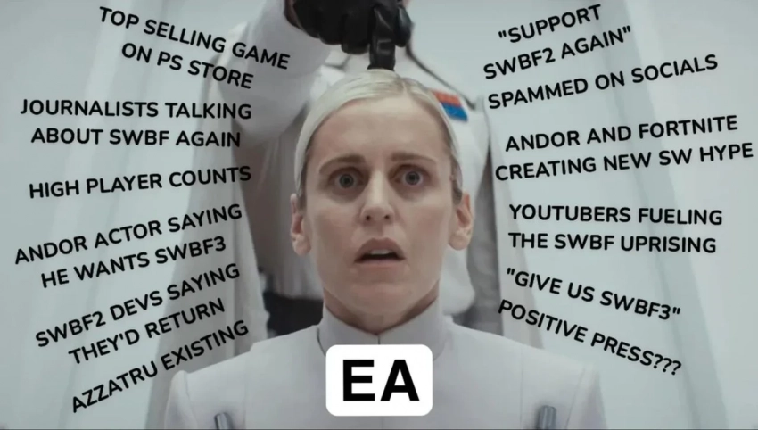 Ещё больше интересных видео на YouTube канале Игромании!Скриншот Star Wars Battlefront 2В последнее время у игроков наблюдается новая волна интереса к фантастическому шутеру Star Wars: Battlefront II (2017). По данным SteamDB, максимальная посещаемость в Steam почти приблизилась к рекордному значению, зафиксированному более четырёх лет назад. И неудивительно, что параллельно с притоком игроков набирает новую силу кампания призывов к EA сделать Battlefront 3.