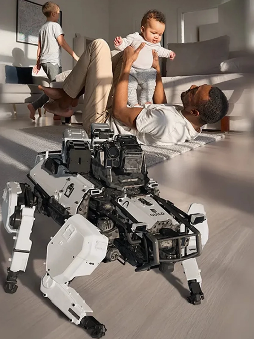 • У The Guild три ключевых продукта антропоморфный робот для автономного патрулирования и оценки угроз; вооруженный наземный дрон для выявления и нейтрализации агрессии (без юридической ответственности владельца) R.A.W.G.; и автономный аэродрон для сканирования, картографирования и оценки рисков в реальном времени.