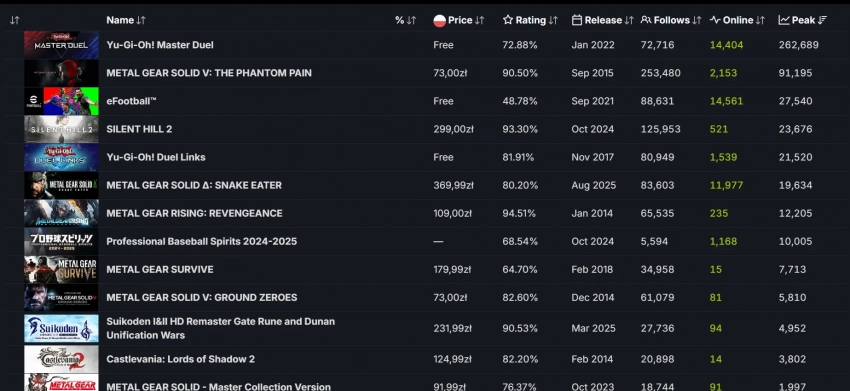 Если говорить про онлайн среди игр Konami в целом, то Metal Gear Solid Delta: Snake Eater расположилась на шестом месте в общем чарте. Например, ремейк Silent Hill 2 на пике собрал на четыре тысячи человек больше.
